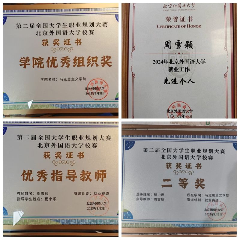 202519日,北京外國(guó)語(yǔ)大學(xué)召開(kāi)2024年就業(yè)創(chuàng)業(yè)工作總結(jié)會(huì)。會(huì)上,學(xué)校對(duì)2024年就業(yè)創(chuàng)業(yè)工作中表現(xiàn)突出的先進(jìn)集體和個(gè)人進(jìn)行了表彰。馬克思主義學(xué)院獲得第二屆全國(guó)大學(xué)生職業(yè)規(guī)劃大賽北外校賽優(yōu)秀組織獎(jiǎng);馬院辦公室主任周雪穎獲得2024年就業(yè)工作先進(jìn)個(gè)人。