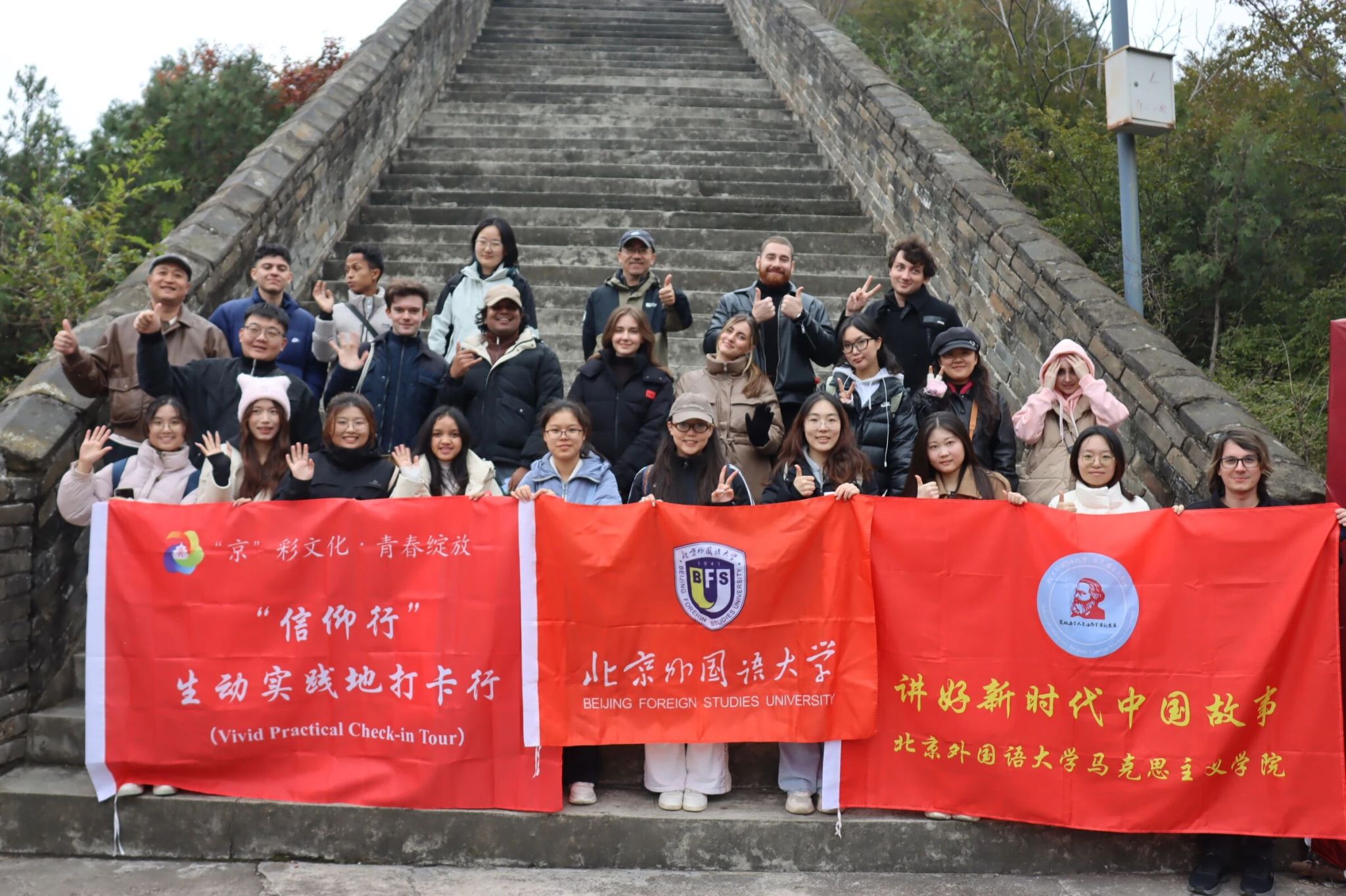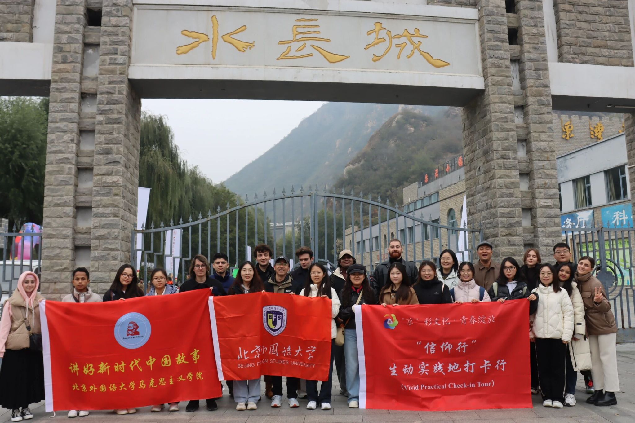 為深入學(xué)習(xí)貫徹習(xí)近平新時代中國特色社會主義思想,引導(dǎo)國際青年深刻感悟中華優(yōu)秀傳統(tǒng)文化的時代價值,北京外國語大學(xué)馬克思主義學(xué)院聯(lián)合留學(xué)生辦公室精心策劃開展“‘京’彩文化 ? 青春綻放”主題實踐活動。本次活動以“從北京長城看全球——從‘歷史脈絡(luò)’到‘全球坐標’”為主線,組織來自國中院、國關(guān)學(xué)院兩個學(xué)院的法國、俄羅斯、巴西、伊拉克、蒙古國、斯洛伐克、哥斯達黎加、馬達加斯加、斯里蘭卡等9個國家的13名留學(xué)生代表以及來自馬克思主義學(xué)院、高翻學(xué)院、國關(guān)學(xué)院的12名北外學(xué)子共赴懷柔區(qū)黃花城水長城與響水湖長城景區(qū),開啟了一場富有深刻教育意義和時代內(nèi)涵的實踐研學(xué)之旅。