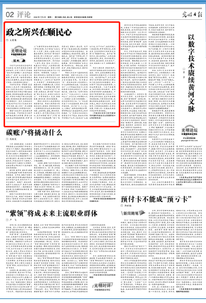 7月4日,《光明日?qǐng)?bào)》第2版《光明論壇》欄目刊登北外馬克思主義學(xué)院王曼倩副教授的文章《政之所興在順民心》。