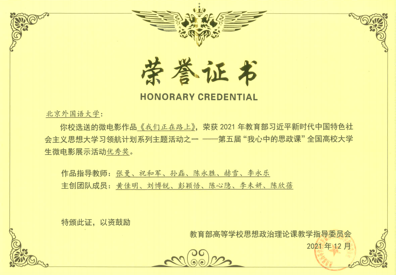 我院張曼、祝和軍、孫磊、陳永勝、赫雪、李永樂教師團隊指導(dǎo)的微電影《我們正在路上》在教育部高等學(xué)校思想政治理論課教學(xué)指導(dǎo)委員會主辦的第五屆“我心中的思政課”全國高校大學(xué)生微電影展示活動中榮獲優(yōu)秀獎。