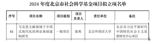 2024年12月28日,北京市社會(huì)科學(xué)基金項(xiàng)目、北京市習(xí)近平新時(shí)代中國(guó)特色社會(huì)主義思想研究中心項(xiàng)目“馬克思文獻(xiàn)視域下中國(guó)式現(xiàn)代化的理論基礎(chǔ)建構(gòu)研究”開(kāi)題論證會(huì)在馬克思主義學(xué)院舉行。會(huì)議采用視頻會(huì)議的形式,梁爽課題組作開(kāi)題報(bào)告,來(lái)自北京大學(xué)、清華大學(xué)、北京第二外國(guó)語(yǔ)學(xué)院和北京外國(guó)語(yǔ)大學(xué)的專(zhuān)家進(jìn)行評(píng)議,北京市習(xí)近平新時(shí)代中國(guó)特色社會(huì)主義思想研究中心北京外國(guó)語(yǔ)大學(xué)研究基地負(fù)責(zé)人和科研處代表參加會(huì)議。北京市社會(huì)科學(xué)界聯(lián)合會(huì)、北京市哲學(xué)社會(huì)科學(xué)規(guī)劃辦公室派專(zhuān)員參會(huì)。