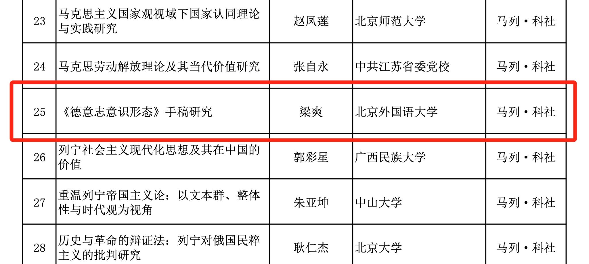 近日,在全國哲學社會科學工作辦公室批準的國家社會科學基金后期資助項目中,我院教師梁爽主持的“《德意志意識形態(tài)》手稿研究”項目獲得立項。