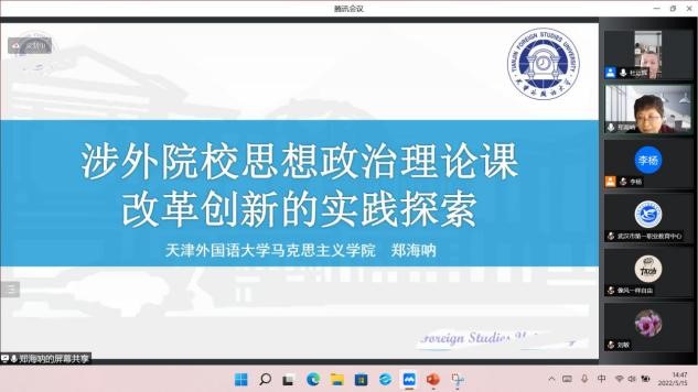 來自天津外國語大學(xué)的鄭海吶教授以《涉外院校思政課改革創(chuàng)新的實踐探索》為題向大家分享了思政課教育改革實踐中的成果與思考。她從提升教師的理論功底、突出外字特色,深化教學(xué)改革、善用大思政,打造特色品牌三個維度介紹和總結(jié)了涉外院校推進思政課改革創(chuàng)新的經(jīng)驗與方法。