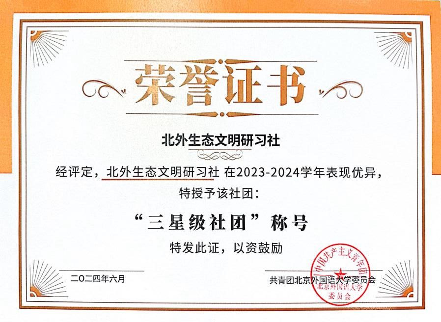 6月12日,北京外國語大學(xué)舉行2023-2024學(xué)年社團星級大會。社團工作部對過去一年的社團工作進行了總結(jié),并公布了星級社團評審結(jié)果。經(jīng)評選,北外生態(tài)文明研習(xí)社榮獲北京外國語大學(xué)2023-2024學(xué)年“三星級社團”稱號。